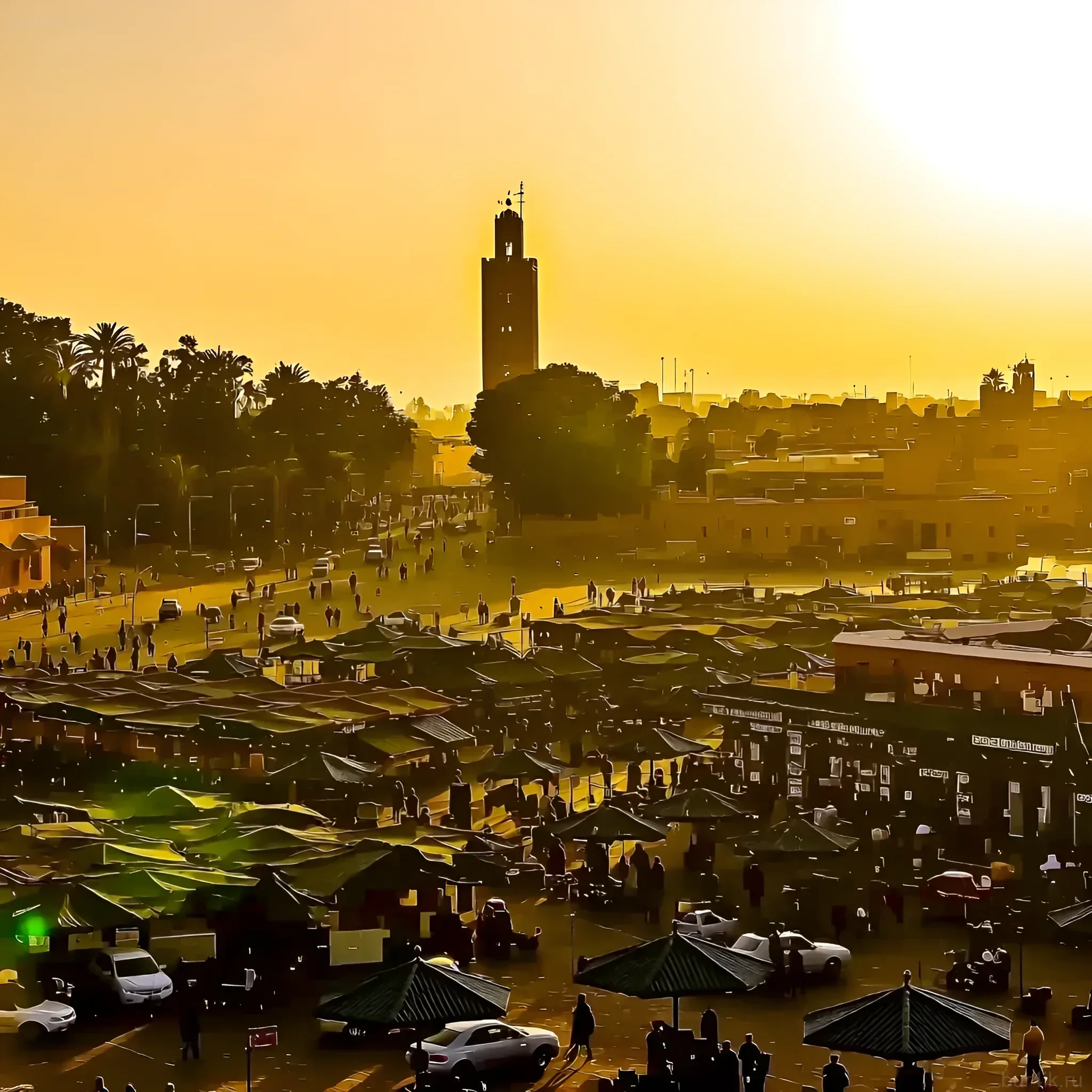 Фотография площади Джемаа-эль-Фна в Марокко, залитой теплым закатным светом. Оживленная сцена с торговцами, людьми и минаретом мечети Кутубия.