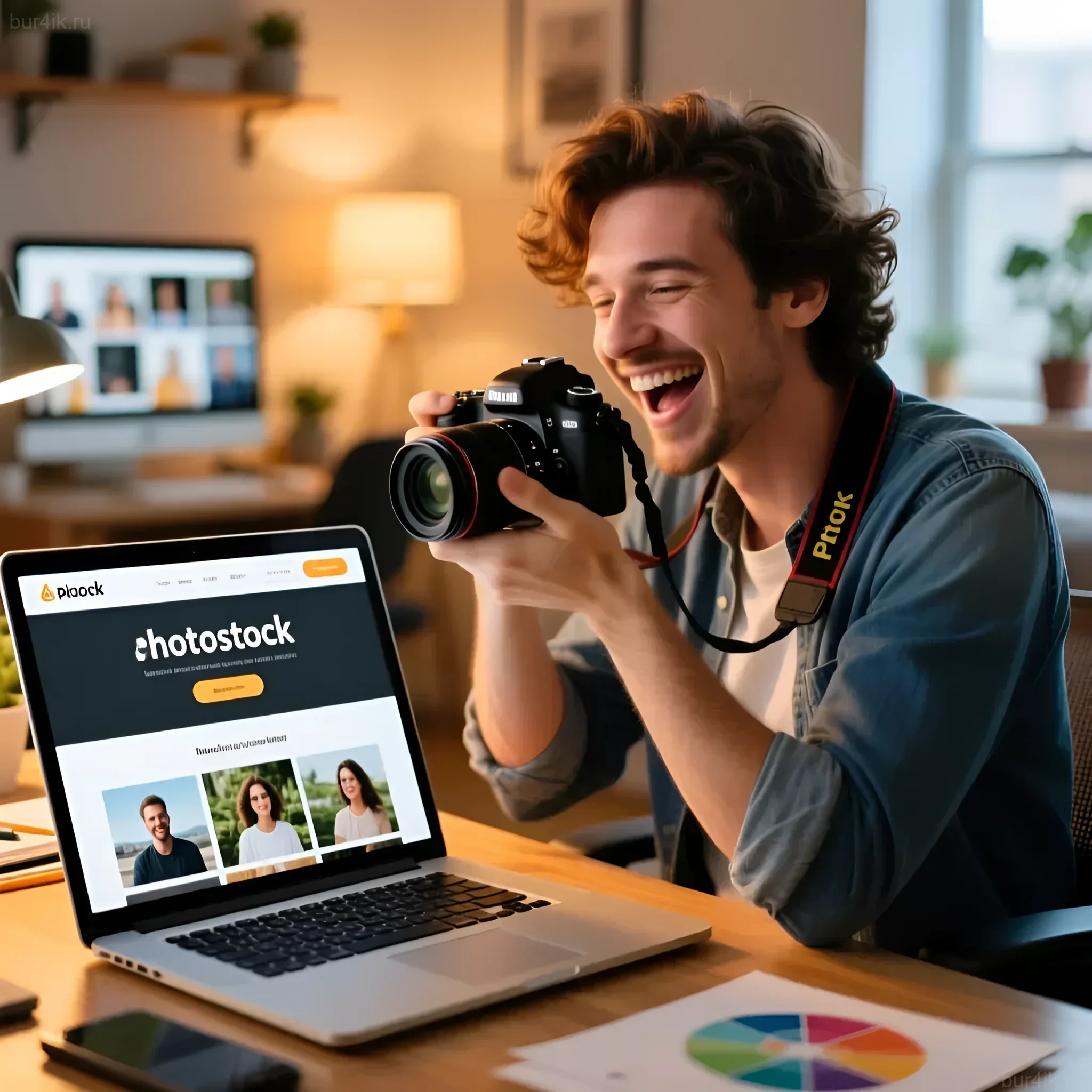 Фотография излучает позитив и энергию. Молодой человек, явно увлеченный своим делом, с энтузиазмом рассматривает свои снимки на экране ноутбука. Композиция удачно построена: взгляд фотографа направлен на экран, что привлекает внимание зрителя к ключевому элементу – интерфейсу фотостока. Теплые тона и естественное освещение создают уютную и вдохновляющую атмосферу. Использование размытия фона (боке) акцентирует внимание на главном объекте. В целом, изображение передает идею успешного и творческого заработка на фотографии.