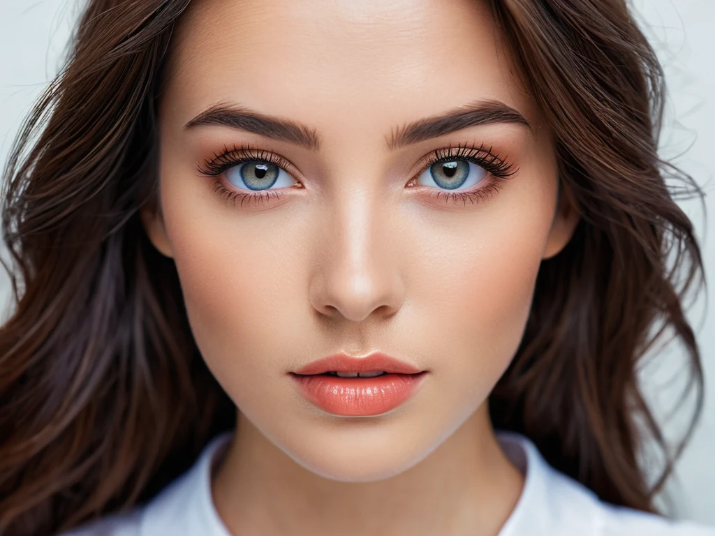 Фотография представляет собой классический портрет с акцентом на глаза модели. Высокая детализация позволяет рассмотреть каждую ресничку и текстуру кожи. Композиция построена таким образом, чтобы максимально выделить лицо модели. Свет мягкий, рассеянный, создает приятное освещение и подчеркивает красоту модели. Цветовая палитра теплая, преобладают оттенки бежевого и коричневого. Вероятно, использовалась открытая диафрагма для создания небольшой глубины резкости и размытия фона.