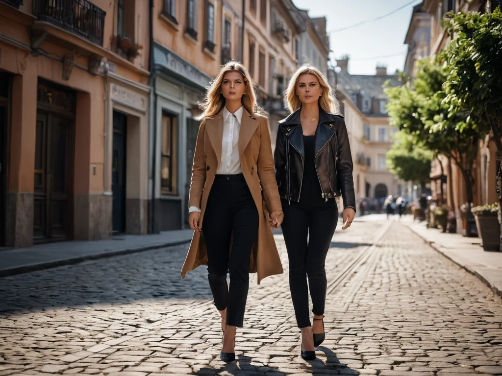 Фотография передает ощущение свободы и легкости. Две девушки, идущие по улице, создают динамичный и привлекательный кадр. Кадр демонстрирует важность композиции в фотографии.