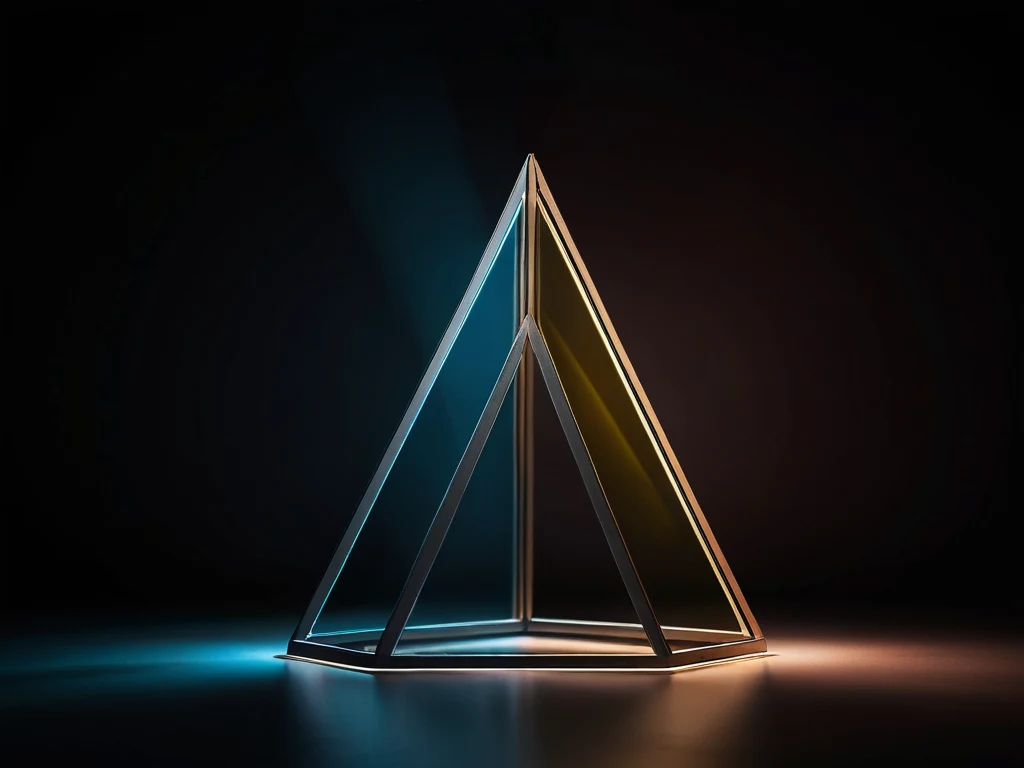 - Работа со светом: Контрастный свет, выделяющий треугольники на темном фоне. Использование цветовых акцентов (синий и золотой) привлекает внимание.