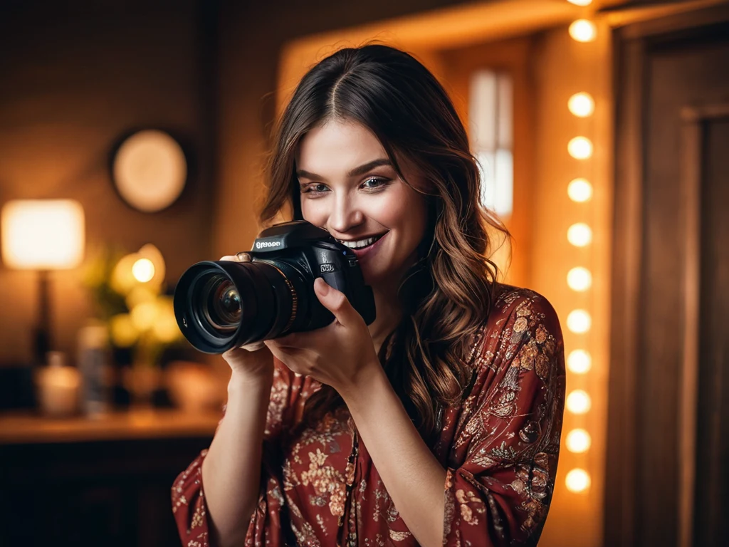 Фотография излучает тепло и позитив. Девушка, увлеченно снимающая на камеру, передает радость от процесса. Кадр создает ощущение вовлеченности и вдохновляет попробовать себя в фотографии.